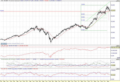 Aconsejamos vender con cierre semanal inferior a 68,10 € / Objetivo pretendido en el rango 56,2 € a 51,15 € / Stop a la recompra con cierre diario superior a 71 €