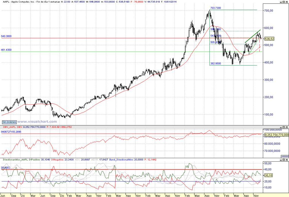 Consejo operativo Apple Inc. (NASDAQ:AAPL) Mktcap 491.06B Rentabilidad por dividendo 2,24% Reiteramos, venta parcial con cierre semanal inferior a 540 $ Objetivo pretendido sobre zona de 460 $ / Stop a la recompra con cierre diario superior a 560 $ | |