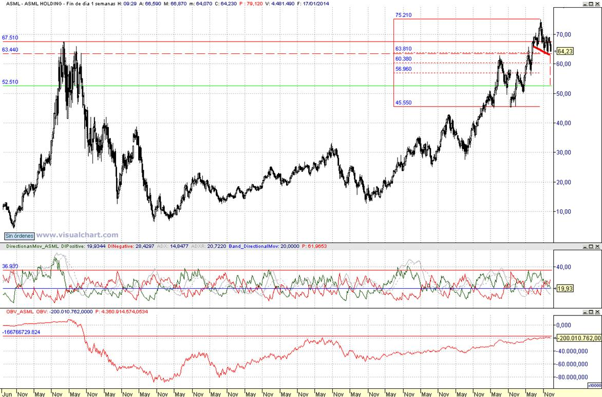 Consejo operativo ASML Holding N.V. (AMS:ASML) Mktcap 28.44 B rentabilidad por dividendo 0.83 % Aconsejaríamos venta parcial ( ADX no muestra aun claudicación alcista) tras cierre semanal inferior a 63,45 €. Objetivo pretendido de medio plazo sobre los 52,5 € / stop a la recompra tras cierre diario superior a 67,5 €. | |