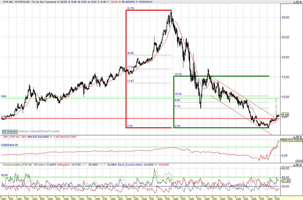 Consejo operativo Banco Popular Aconsejariamos con visión de largo plazo primeras compras ( falta cancelación ondas bajistas por ADX del año 2012/2013) de ser asi incrementariamos Objetivo de largo plazo top operacional sobre 9,60 € / Stop loss < 4,5 € |