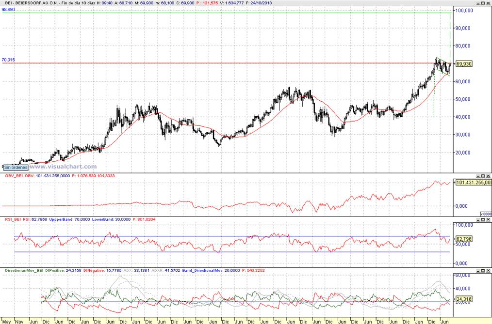 Consejo operativo Beiersdorf AG (FRA:BEI ) Mktcap 15.77 B Rentabilidad por dividendo 1,01% Aconsejaríamos seguir muy de cerca este título, debido a la conjunción de buena calidad fundamental y aspecto técnico Es por ello que consideraríamos optimo, la entrada larga en el titulo y con vocación a priori de largo plazo, tras la superación y consolidación de los entornos de 70,30 € / Objetivo pretendido Top sobre 98,70 € / Stop loss < 66,20 € al cierre semanal J.J. Berrocal GVC Madrid |