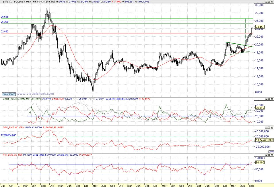 El crecimiento de la negociación bursátil catapulta a BME hasta máximos de 2010 Niveles de enero de 2010. Ese es el terreno al que han vuelto esta semana las acciones de Bolsas y Mercados Españoles (BME). La subida ha sido lenta, pero sin pausa. Los números hablan de un repunte en lo que va de año del 30% y el entorno cada vez es más favorable. Las buenas perspectivas en torno al mercado español invitan a pensar en un escenario más propicio para la negociación bursátil. Así lo confirman los últimos datos ofrecidos por la compañía. Según BME, la bolsa española negoció en septiembre 48.277 millones de euros, una cuantía apenas un 1% inferior que en el mismo mes del pasado año. Pero lo que resulta más reseñable es el crecimiento del número de operaciones. El pasado mes superó los 4,7 millones, lo que supone un crecimiento respecto al mismo periodo del año anterior del 88