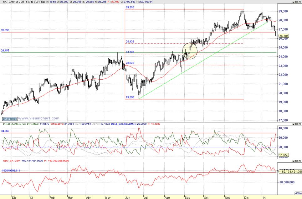 Consejo operativo Carrefour SA (EPA:CA) Mktcap 37.8 B rentabilidad por dividendo 2,21 % Aconsejamos venta parcial de corto plazo ( incipiente cancelación onda alcista, Nov 2013) 1 Objetivo pretendido sobre 24,45 € Stop a la recompra tras cierre diario superior a 26,7 € | |