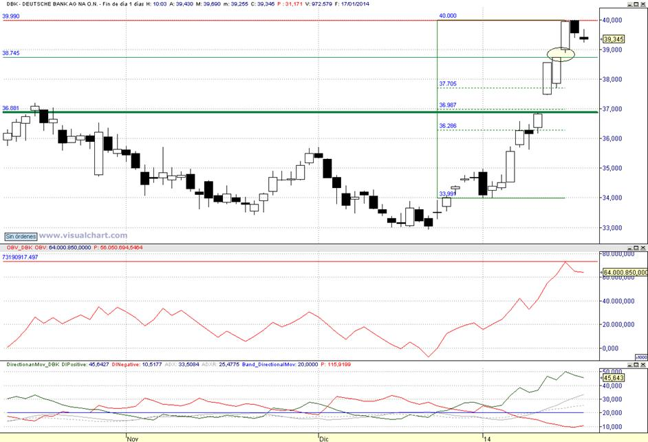 Consejo operativo Deutsche Bank AG (FFT:DBK) Mktcap 40.12B rentabilidad por dividendo 1,91% Aconsejaríamos venta parcial especulativa de corto plazo ( adx no muestra deterioro alcista) incrementando por debajo de 38,7 € / Objetivo de recompra sobre 36,90 € / 1º Stop a la recompra con precios de cierre superiores a 40 € |