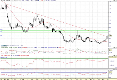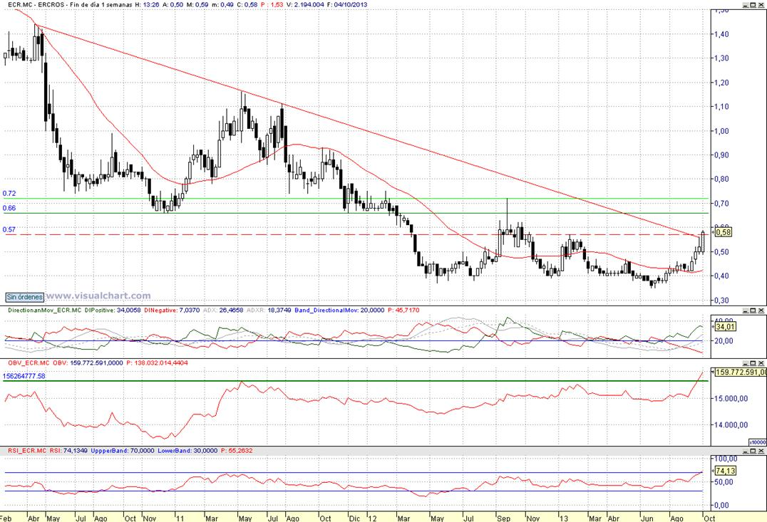 Consejo operativo ERCROSAconsejaríamos compra muy residual, tras superación y consolidación semanal de la zona de 0,57 € / Objetivo rengo 0,66 € a 0,72 € Stop loss < 0,56 € al cierre diarioComparte esto:TwitterFacebookWhatsApp
