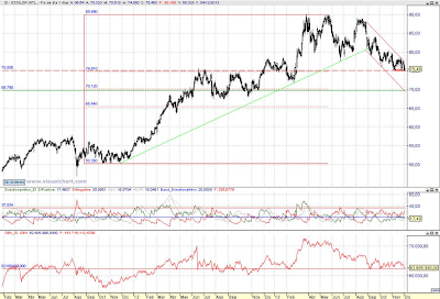 Aconsejaríamos venta parcial tras cierre diario inferior a 75,05 € / Objetivo pretendido de recompra sobre zona de 69,8 € Stop a la recompra tras cierre diario superior a 77,65 € | |