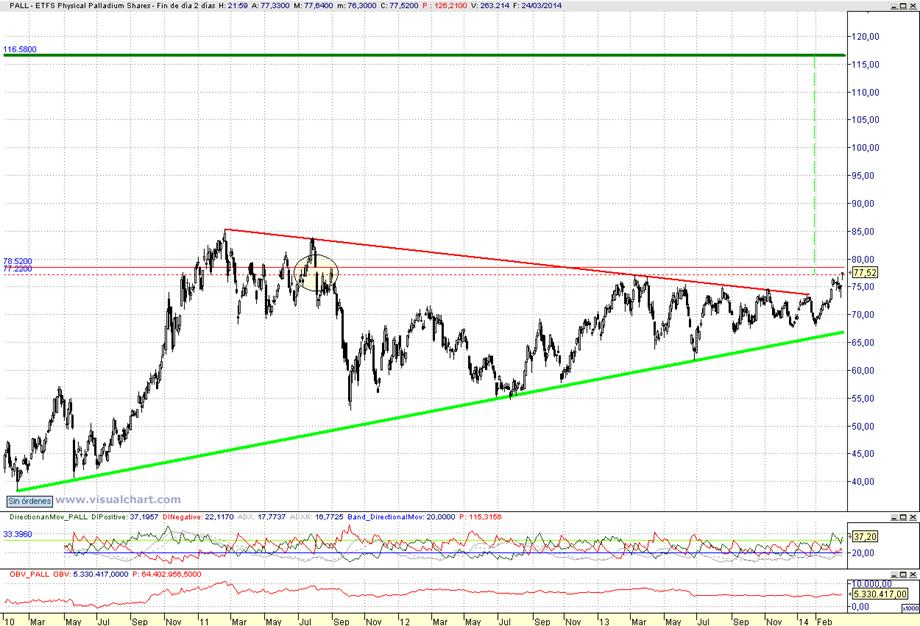Consejo operativo ETFS Physical Palladium Shares (NYSEARCA:PALL) Mktcap 485.92 M Reiteramos consejo de compra y en este caso incrementar tras cierre diario superior a 78,55 $ Objetivo pretendido de medio y largo entre 85,75 $ a 116,6 $ top modificado / Stop loss < 74,20 $ al cierre | |