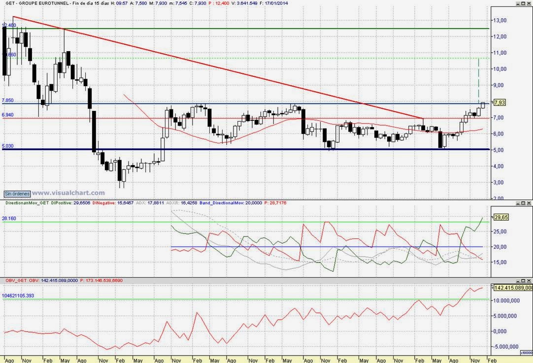 Consejo operativo Groupe Eurotunnel SA (EPA:GET ) Mktcap 4.22B Rentabilidad por dividendo 1,53% Reiteramos, la compra de cara al medio y largo plazo, tras superación y consolidación de la zona de 7,85 € Objetivo pretendido en el rango 10,65 € a 12,5 € según aviso del pasado dia 3 de Enero Stop loss parcial < 7,4 € y total por debajo de 7,20 € en cierre semanal | |