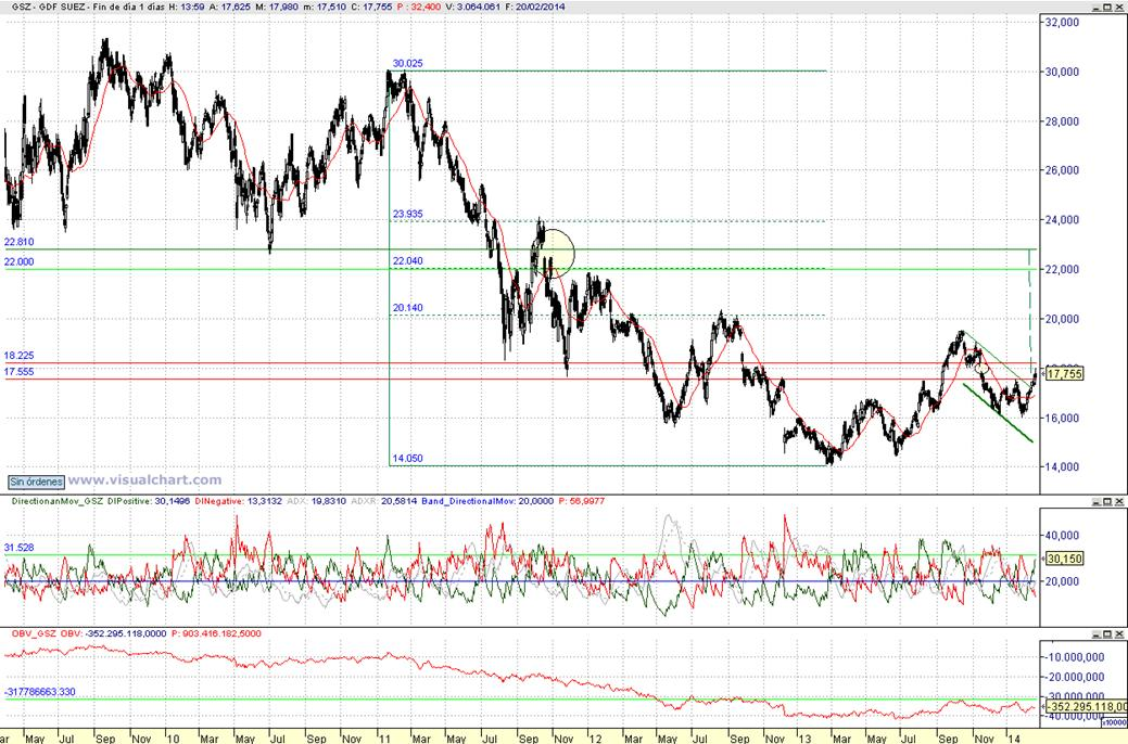 Consejo operativo GDF Suez SA (EPA:GSZ) Mktcap 41.96 B Rentabilidad por dividendo 8,43 % Aconsejaríamos compra moderada ( obv –adx no apoyan) o bien sobre 17.55 € o tras cierre diario superior a 18,25 € Objetivo de medio y largo plazo sobre 22,8 € / Stop loss < 17,2 € al cierre diario | |