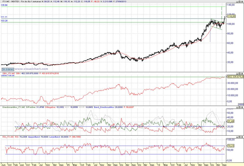 Consejo operativo: Inditex Aconsejamos establecer stop de protección a los largos con cierre diario semanal inferior a 111,10 € vs Objetivo pretendido top sobre 135,95 € |