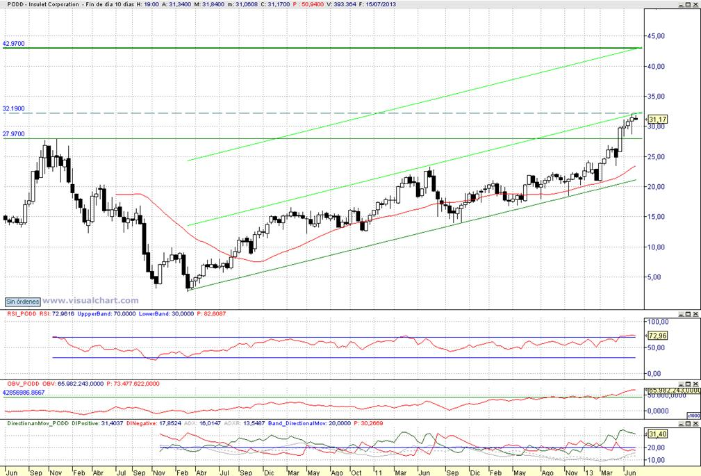Objetivo pretendido TOP área de 42,95 $ / Stop loss al cierre < 30,05 $ parcial y total < 28 $