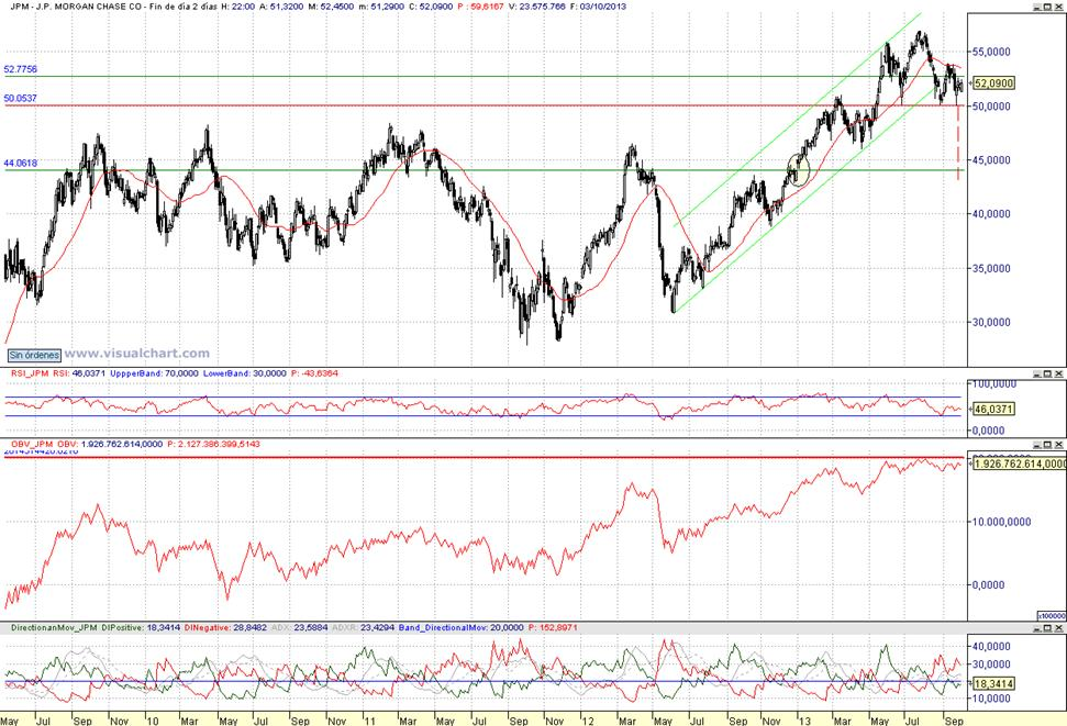 Consejo operativo JPMorgan Chase & Co (NYSE:JPM ) Mktcap 196.12 B Rentabilidad por dividendo 2,92% Aconsejaríamos vender tras cierre diario inferior a 50,05 $ Objetivo pretendido top sobre los entornos de 44,10 $ / Stop a la recompra con cierre diario superior a 52,8$ | |