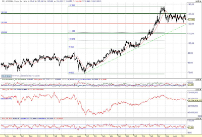 Consejo operativo L’Oreal SA ( PA:OR) Mktcap 74.14B Rentabilidad por dividendo 1,85% Aconsejaríamos venta parcial tras cierre diario inferior a 120 € / Objetivo pretendido top sobre área de precios de 110 € /Stop a la recompra con cierre diario superior a 123,2 € | |