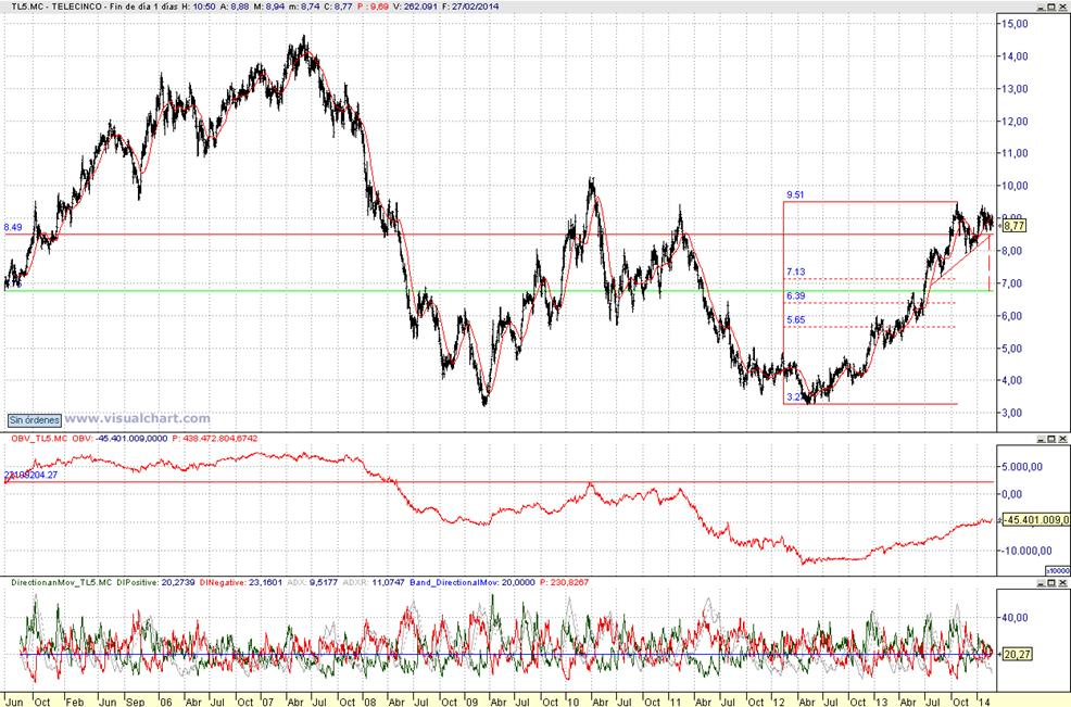 Consejo operativo Mediaset Aconsejaríamos venta parcial e incrementar con cierre diario inferior a 8,47 € ( Desajuste por OBV y ADX dubitativo) Objetivo pretendido de medio plazo sobre los entornos de 7,1 € a 6,75 € ¡º Stop a la recompra con precios de cierre superiores a 9,2 € |