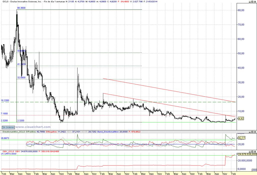 Consejo operativo Oculus Innovative Sciences, Inc. (NASDAQ:OCLS) Mktcap 35.62 M Aconsejaríamos la inversión en el titulo pero muy residualmente y en dos tramos, primeramente sobre actuales niveles y posteriormente si observáramos un cierre semanal superior a 7,2 $ Buscaríamos objetivos potenciales alcistas de medio y largo plazo sobre los 16,2 $ / 1ºstop loss < 3,90 $ cierre semanal |