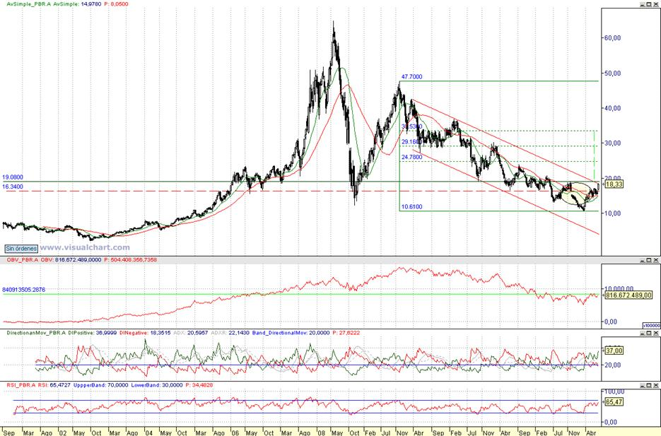 Consejo operativo Petroleo Brasileiro Petrobras SA (ADR) (NYSE:PBR.A) Mktcap 115.81B rentabilidad por dividendo 4,05% Aconsejaríamos de cara al largo plazo primeras compras tras cierre semanal superior a 19,1 $ Objetivo pretendido top sobre los 33 $ / Stop loss < 17,75 $ al cierre semanal | |
