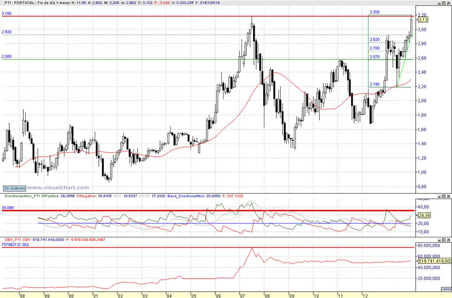 Consejo operativo Portucel SA(ELI:PTI ) Mktcap 2.25 B rentabilidad por dividendo 8,94 %Aconsejaríamos vender ( desajuste por OBV en el largo plazo ) e incrementar con cierre mensual inferior a 2,92 €Objetivo top pretendido sobre 2,60 € / 1º Stop con cierre semanal superior a 3,2 €Comparte esto:TwitterFacebookWhatsApp