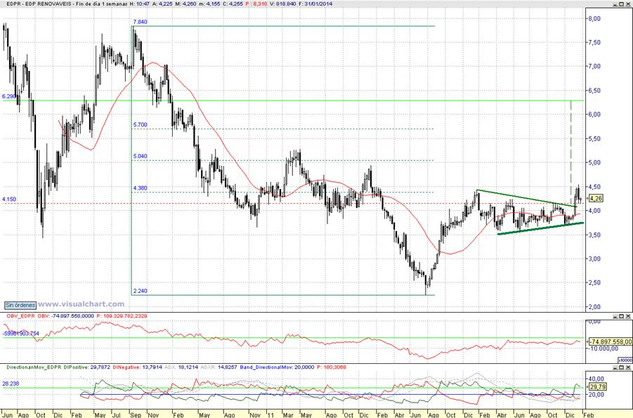 Consejo operativo EDP Renovaveis SA (ELI:EDPR) Mktcap 3.72 B rentabilidad por dividendo 0.94% Aconsejaríamos compra parcial sobre actuales niveles de cara al medio y largo plazo, pensando en incrementar con lectura positiva por OBV Objetivo pretendido sobre el área de precios de 6.3 € / Stop loss < 3.90 € al cierre semanal | |