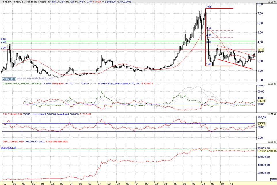 Tubacex tiene que consolidar la ruptura de los 2,80 euros para seguir con el movimiento impulsivo que le ha de llevar a buscar la siguiente zona de resistencia sobre los 3-3,20 euros. Este nivel es la antesala de la búsqueda del objetivo teórico completo del patrón de vuelta de hombro-cabeza-hombro con el que marcó el cambio de escenario en el valor y que tiene situado sobre los 3,50-3,60 euros. También se corresponden con los máximos de 2009 y una zona de techos del canal con el que proyecta el actual movimiento de avance y que como espacio temporal debería buscarlo en los próximos seis meses. El valor tiene una zona de soporte en el corto plazo sobre los 2,60 euros que puede extenderse hasta la proyección de su directriz de avance actual y base del canal coincidiendo su proyección con los mínimos de hace dos semanas en los 2,48 euros.