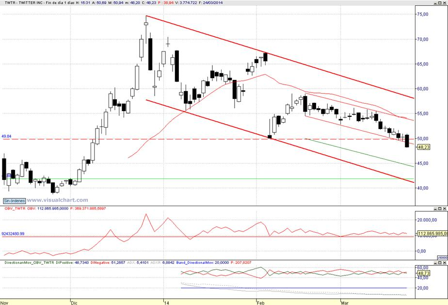 Consejo operativo Twitter Inc (NYSE:TWTR Mktcap 29.49 B Reiteramos venta parcial de corto plazo tras cierre diario inferior a 49,8 $ ( faltaría confirmación por OBV) Objetivo en rango de precios entre 45 $ y 41,8 $/ Stop a la recompra tras cierre diario superior a 52,40 $ Según aviso del pasado dia 21 de marzo | |