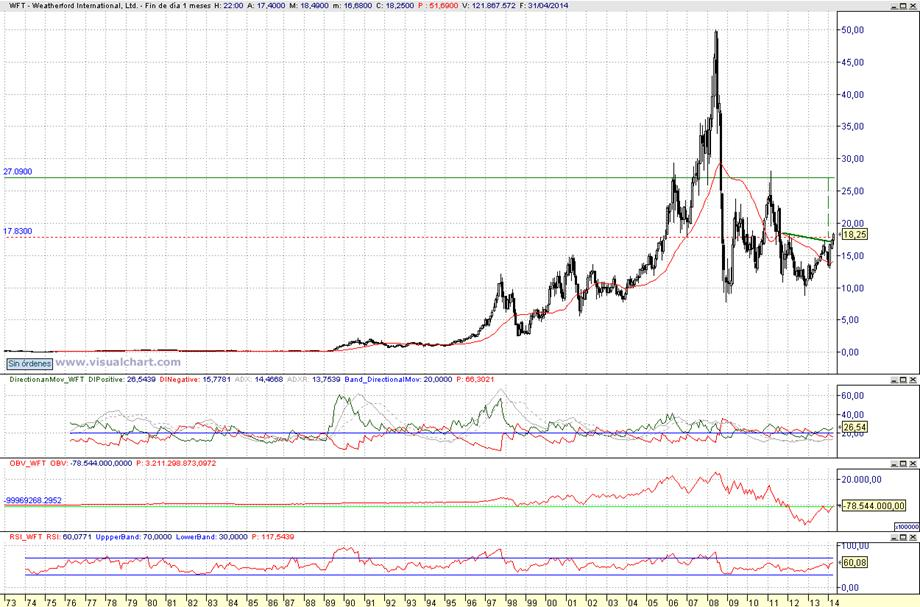 Consejo operativo Weatherford International Ltd (NYSE:WFT ) Mktcap 14.00 B Aconsejaríamos compra moderada de cara al largo plazo ( beta 2.29) tras consolidación mensual de la zona de 17,85 $ Objetivo pretendido top sobre los entornos de 27,10 $ / Stop loss < 17,30 $ al cierre diario | |